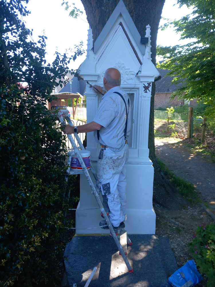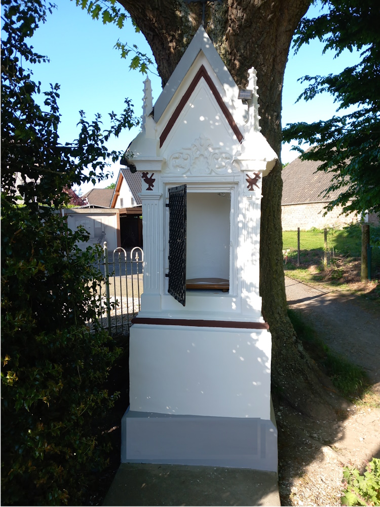 Eifrige Kirchenvorsteher hatten in Zusammenarbeit und mit Unterstützung der Stadt Kalkar die über 200 Jahre alte Wegstation restauriert, gestrichen und innen auch für die anstehende Fronleichnamsprozession mit einem kleinen Podest ausgestattet.