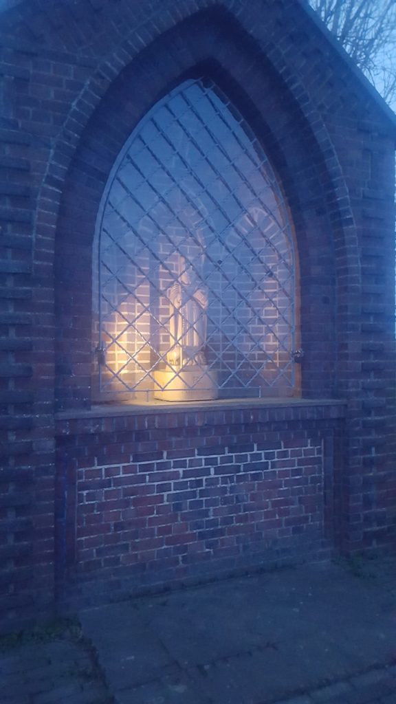 Dort kam es nach dem Marienlied zu einer besonderen Aktion: Bevor die Marienfigur hinter dem neu verglasten und gestrichenen Gitter verschwand, durfte jeder der Reihe nach die Figur in die Hand nehmen und weitergeben. Schließlich stellte die Nachbarin Sigrid Dörning das Marienbild ins Heiligenhäuschen.