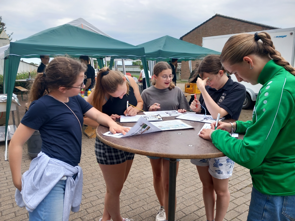 Viele Radler besuchten die Kläranlage bei Kalkar radelt am 30. Juni 2024, wobei die Führungen durch den Leiter Heinz Arntz (am Stehtisch) regen Zuspruch fanden. Reißenden Absatz (fast 200 Teilnehmer!) fand auch das Kreuzworträtsel – besonders auch bei der Jugend, bei dem man sein Wissen testen und schöne Preise gewinnen konnte.