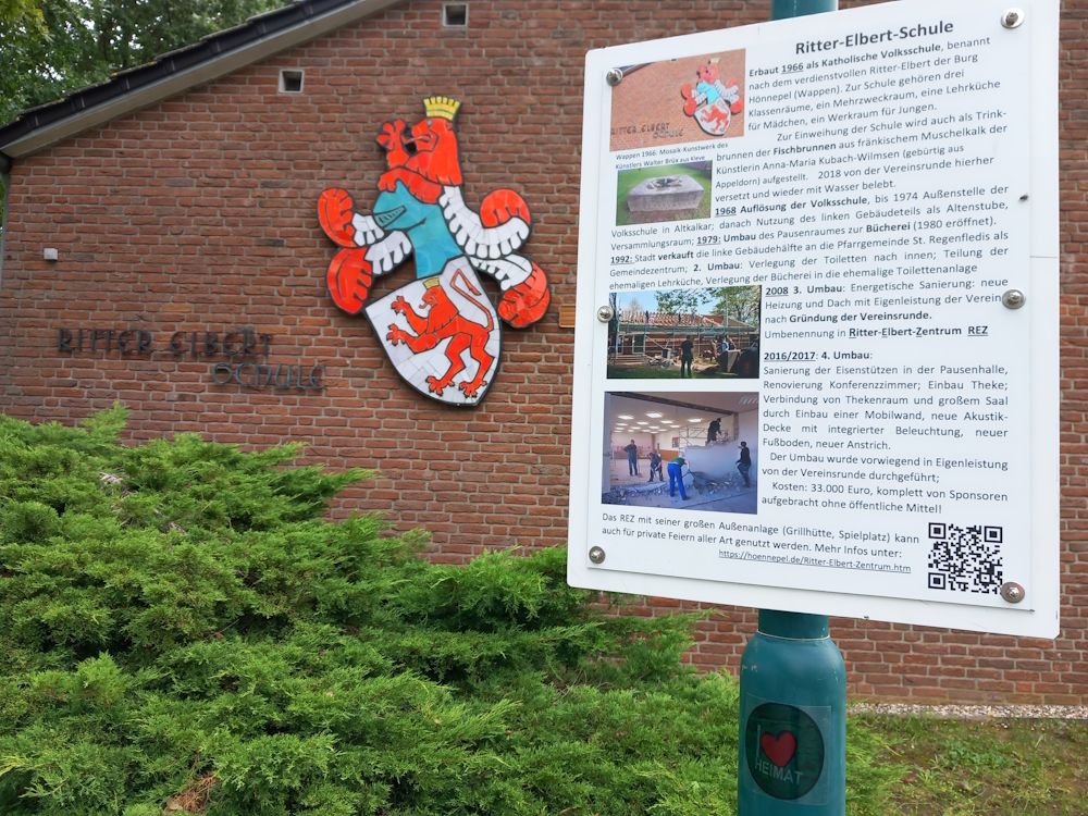 2023: Neue Info-Tafel informiert: Von der Ritter-Elbert-Schule (1966) zum heutigen Ritter-Elbert-Zentrum (REZ): Feier- und Veranstaltungszentrum, Heimat der Vereine/Gruppen in Hönnepel.