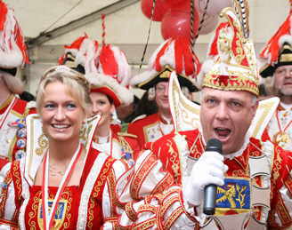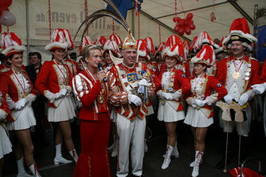 Das Prinzenpaar und die stattliche Prinzengarde des Gocher Reitervereins sorgten für Superstimmung im überfüllten Zelt auf der Kläranlage, auf der Prinz Heinz als Chef fungiert. Viele Bürger aus Hönnepel waren der Einladung gefolgt und feierten begeistert mit