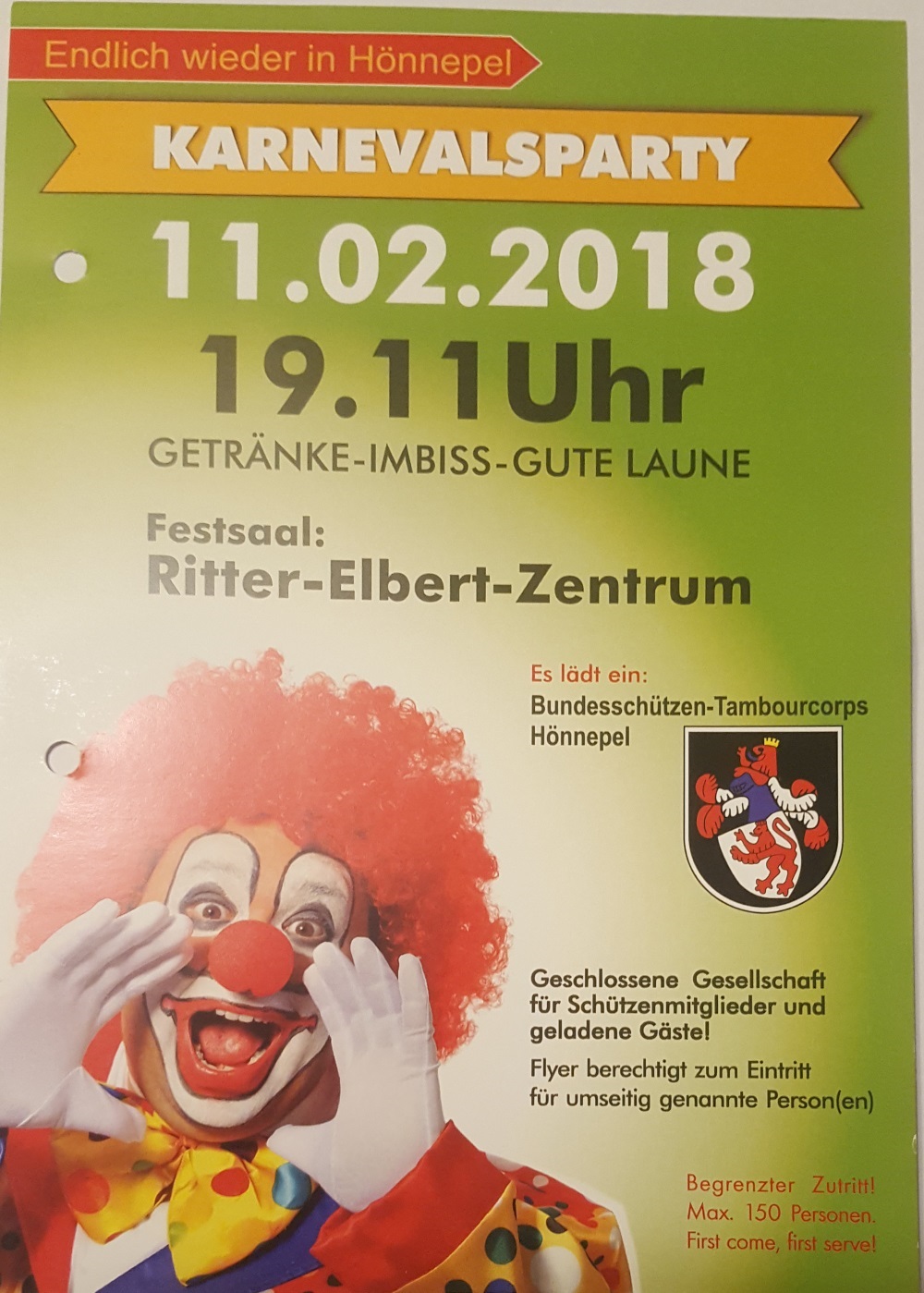 Zum ersten Mal wieder nach 15 Jahren: Karnevalsparty in Hönnepel, wozu das BTC in den Festsaal des REZ eingeladen hatte. Stimmung, Spaß und auch auch Bütten waren prima, wobei auch das von der Vereinsrunde gemeinsam renovierte REZ aufs Korn genommen wurde, das jetzt für Partys und Dorffeste sich sehr großer Beliebtheit erfreut.