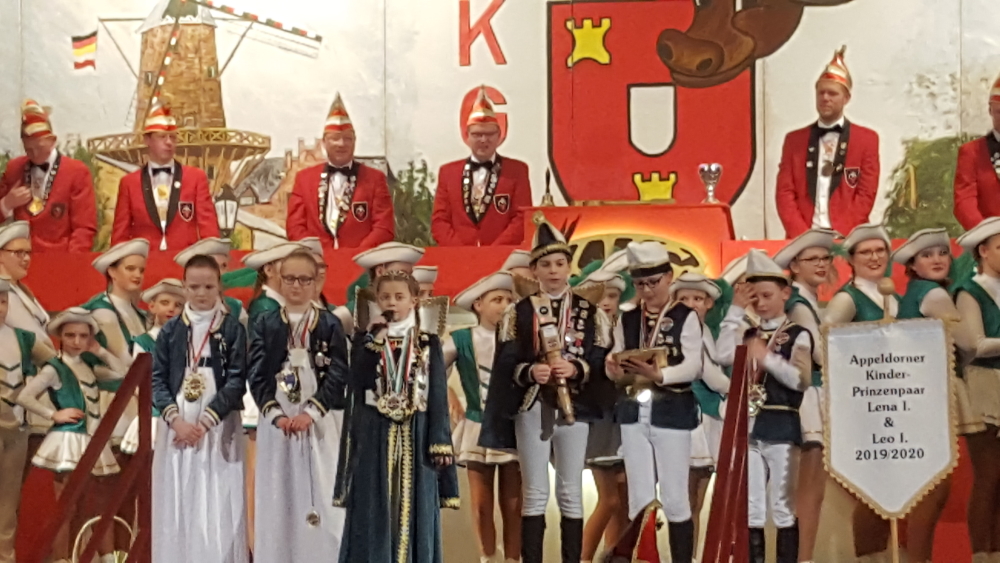 Großer Auftritt des Appeldorner Kinderprinzenpaares Leo I. und Lena I. (Hönnepel) mit Gefolge auf der Sitzung der Kalkarer KKG im PZ